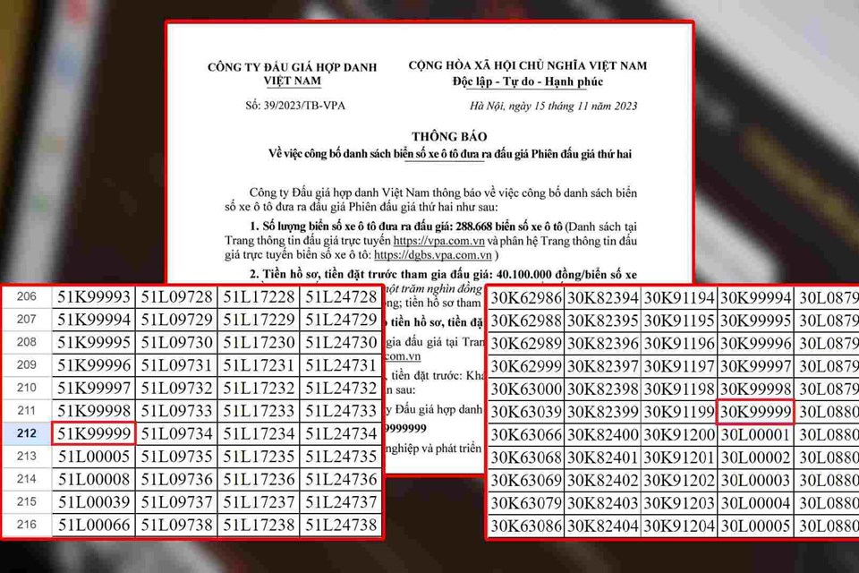 Đấu giá biển số đẹp: Mới đây, Công ty Đấu giá hợp danh Việt Nam (VPA) đã công bố danh sách 288.668 biển số xe ô tô sẽ được đưa ra đấu giá trong Phiên đấu giá thứ hai. Trong đó, xuất hiện nhiều biển số ngũ quý siêu đẹp của Hà Nội và TPHCM như: 30K-999.99; 51K-999.99;…