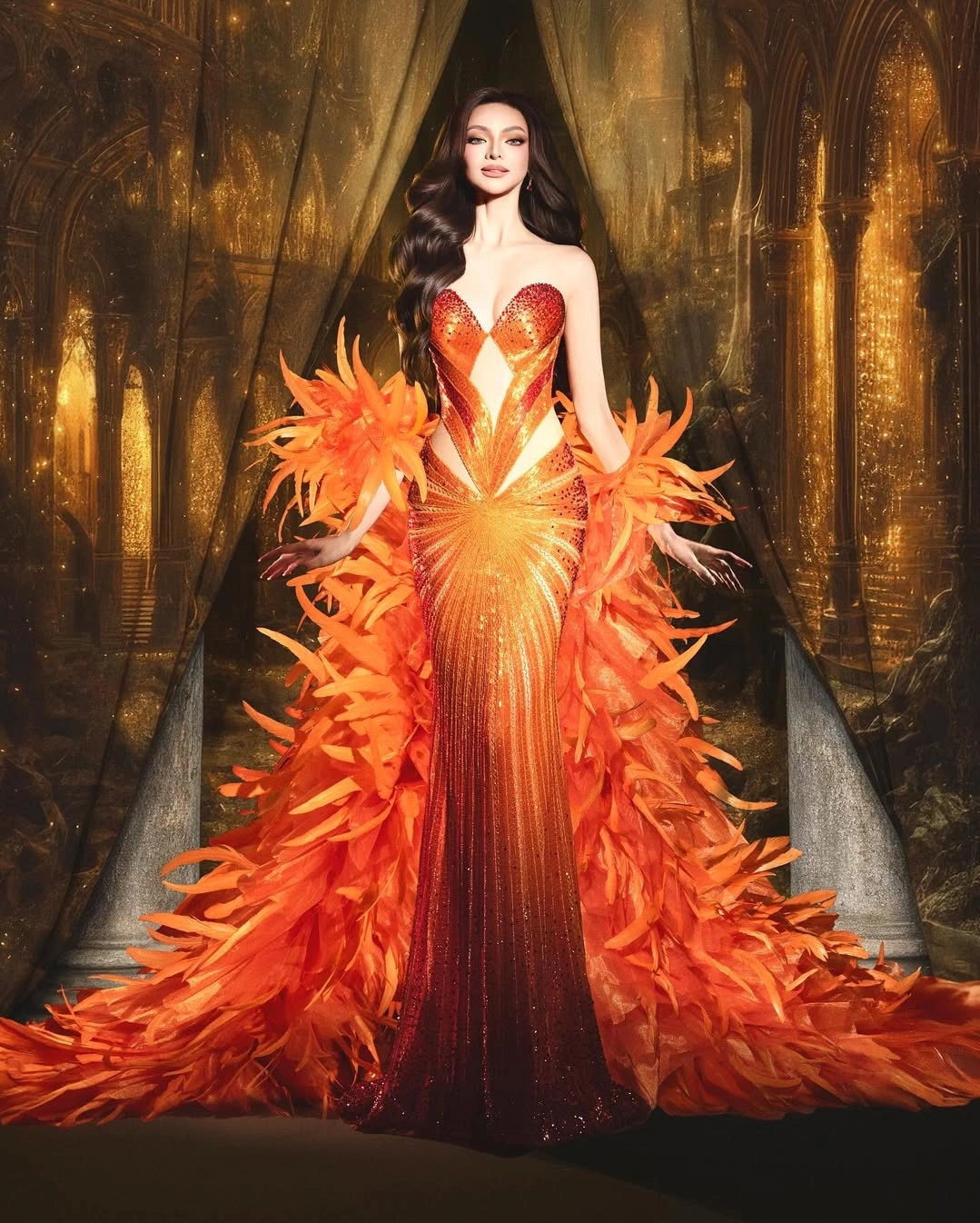 Váy có phom dáng cúp ngực kết hợp áo choàng lông vũ. Đá được đính dọc thân váy còn phần eo cut-out tôn đường cong người mặc. Ảnh: Instagram Emma Tiglao