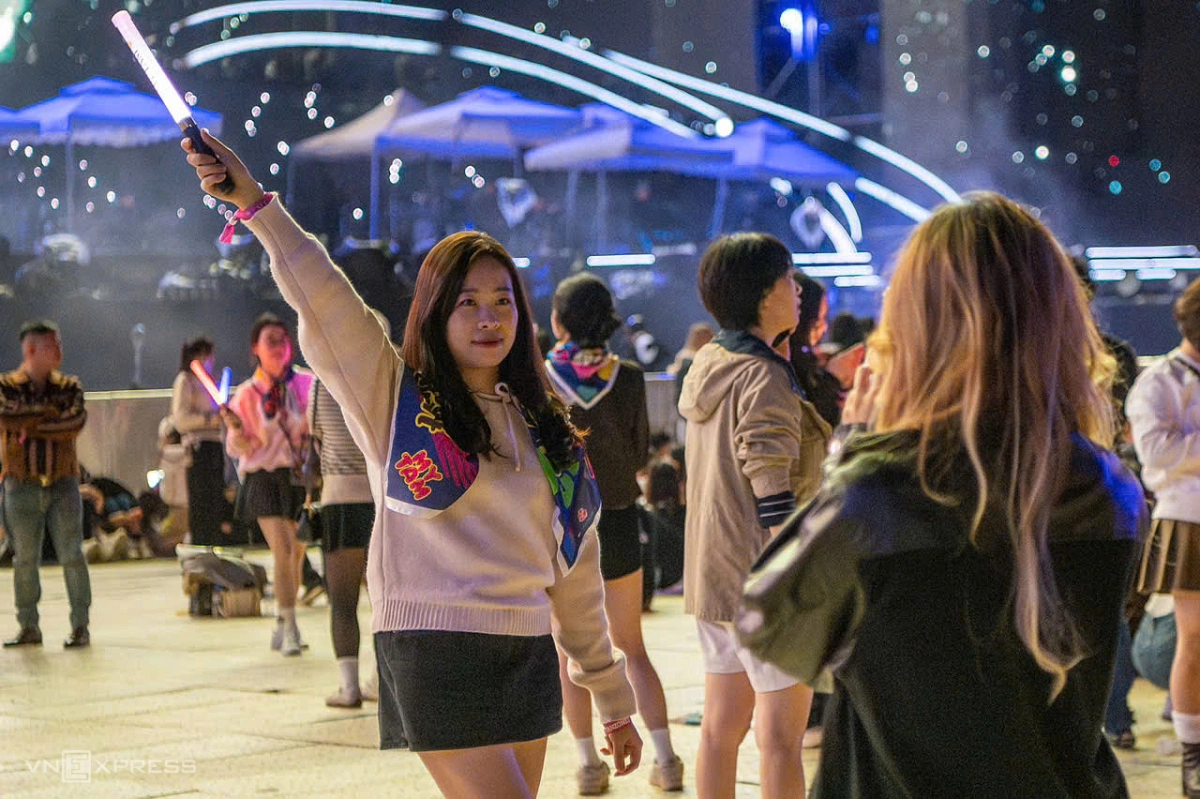 Khán giả cầm lightstick (que phát sáng) chụp ảnh.