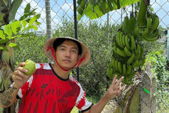 Ca sĩ Phạm Trưởng hái chuối trong vườn. Video: Nhân vật cung cấp