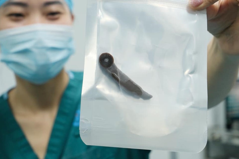 Các bác sĩ Bệnh viện Nội tiết Trung ương vừa lấy thành công dị vật sống là một con đỉa suối có kích thước khoảng 6cm cho bệnh nhân Bùi Văn Đảo, 53 tuổi, trú tại huyện Thạch Thất, Hà Nội.
