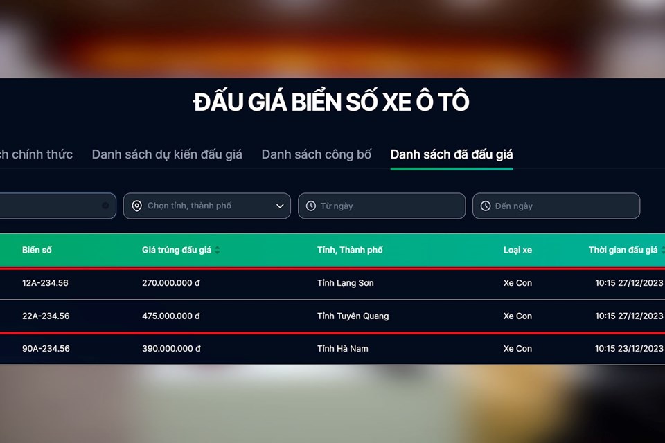 Đấu giá biển số: Trong sáng ngày 27.12, Công ty Đấu giá hợp danh Việt Nam (VPA) đã tổ chức đấu giá 3500 biển số trong 5 khung giờ. Sau khi kết thúc phiên đấu giá, biển số 12A-234.56 và 22A-234.56 chỉ có mức trúng đấu giá lần lượt là 270 và 475 triệu đồng.